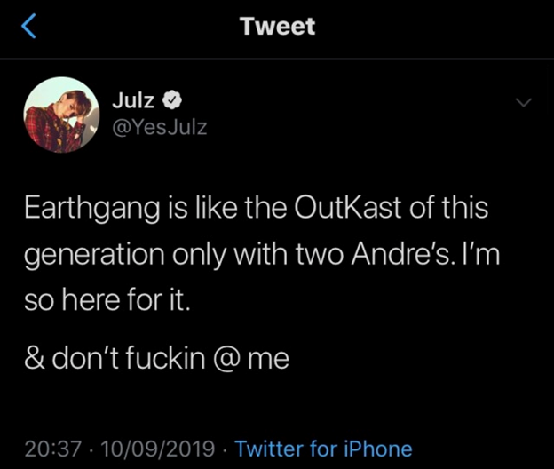 The album itself had gotten so much buzz that controversial social media influencer Yes Julz tweeted; “EarthGang is like the Outkast of this generation only with two André’s. I’m so here for it”. The dangers behind the statement lie within how many modern musicians are influenced by artists of the past. Musicians might be lauded with comments like “they aren’t making good music like they use too anymore”.
